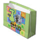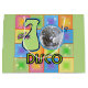Large lime glossy gift bag with an image, on the front, of a shining Disco ball, a staple of the 70s, on a colourful pastel background of fuchsia, orange, blue, green, purple, and yellow squares. See the entire Disco 70s Gift Bag collection in the PARTY FAVORS section.