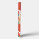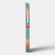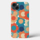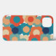 This phone case has a 1970s design of flowers in shades of orange, blue, and cream.