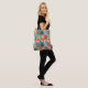 This tote bag has a 1970s design of flowers in shades of orange, blue, and cream.