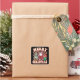 "Merry Christmas" retro 1970's style with Santa Claus and happy Xmas tree, plus presents!  Black background with check backdrop and snowdrop border.  This design really gets the seventies holiday vibes.  Ideal for mail or gift packages.