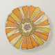 A modern whimsical pillow with a large simple retro orange and gold flower.