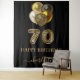 A tapestry for a glamourous 70th birthday party. A black background, decorated with balloons. With the text: Happy Birthday. Personalise and add a name. The name is written in dark rose gold with a modern hand lettered style script with swashes. Number 70 is written with a trendy balloon style font, leopard pattern. To keep the swashes only delete the sample name, leave the spaces or emoji's in front and after the name. Can be used as a welcome banner, wall decor for the party or as a photo booth backdrop.