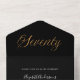 A black background, decorated with Seventy written with a large font in faux gold. Personalise and add name, party details, RSVP date, return address and name.