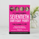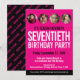 Bold simple graphic hot pink, black and white unisex photo template 70th birthday invitation. Personalise this milestone birthday invitation with your own birthday party event details, and four different photos of your birthday girl in the photo circles. Other years colours and matching items are available. © Original design by Sarah Trett for www.mylittleeden.com on Zazzle.