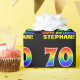 This colourful, cheerful, and fun birthday-themed wrapping paper design features a large number "70" and the message "HAPPY BIRTHDAY,", both having a rainbow spectrum gradient inspired pattern colouring, along with a bold yellow personalised recipient name. The background is coloured black. Fun birthday themed wrapping paper like this may be used to wrap a gift or present being given to celebrate somebody’s 70th birthday. [~Z0000475]