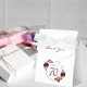 Front and back: A chic white background with a faux gold geometric frame. Decorated with dark purple and burgundy flowers, roses and boho style feathers. The name is written with pink hand lettered style script. The date is written with black numers and age 70 in burgundy.