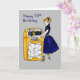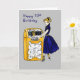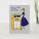 Retro hand drawn young Lady with a pony tail and saddle shoes, playing a Juke Box. Cute card to wish an older person of 70, a happy birthday.