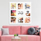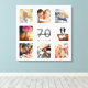 A unique 70th birthday gift or keepsake, celebrating her life with a collage of 8 of your photos. Add images of her family, friends, pets, hobbies or dream travel destination. Personalise and add a name, age 70 and a date. Grey and black coloured letters. A chic white background.