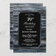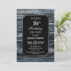 A rustic silver-bordered blue and grey barn wood 70th birthday dinner invitation with the white text highlighted on a black background.