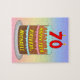 This cheerful and fun birthday jigsaw puzzle design features a cartoon-style depiction of a three-tier birthday cake having number-shaped candles on top showing the age “70“, along with the message “HAPPY 70TH BIRTHDAY,”, and an editable recipient name. The background has a multicolored pastel rainbow spectrum inspired gradient pattern. A colourful, customisable birthday puzzle like this might be a fun way to deliver a birthday greeting message to somebody who is celebrating their seventieth birthday. [~Z0000621]