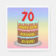 This cheerful and joyful birthday-themed paper napkin design features a cartoon-style depiction of a three-tier birthday cake having number-shaped candles on top showing the age “70“, along with the message “HAPPY 70TH BIRTHDAY,”, and a personalised recipient name. The background has a multicolored pastel rainbow spectrum inspired gradient pattern. Paper napkins like these might be used when celebrating somebody’s 70th birthday. [~Z0000623]