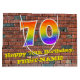 This fun and colourful birthday gift bag design, inspired by graffiti, features a large number "70" having a rainbow spectrum gradient inspired pattern. It also features the message "Happy 70th Birthday,", and a customisable name. The background features a brick wall inspired pattern. A vibrant birthday themed gift-bag like this might be used when giving a gift or present in celebration of somebody’s 70th birthday. [~Z0000522]