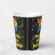 This colourful and cheerful music themed birthday paper cup design features a large number “70” having a rainbow spectrum gradient inspired pattern. It also features the message “Happy 70th Birthday,”, and an editable name. The background features a colourful pattern having music notes and symbols of various colours and sizes. Vibrant, colourful paper cups like this might be fun to use at a birthday party/celebration being held to honour somebody’s seventieth birthday. [~Z0000541]