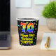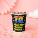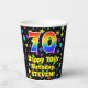 This colourful and fun birthday themed paper cup design features a large number “70” having a rainbow spectrum gradient inspired pattern. It also features the message “Happy 70th Birthday,”, and a custom name. The background features a multicolored star field inspired pattern. Colourful, vibrant paper cups like this might be fun to use at a birthday party being held to honour somebody’s seventieth birthday. [~Z0000540]