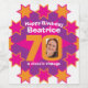Bright pink and yellow 70th birthday add your own photo wine labels. Add your own seventieth birthday photo to the 0 of 70 and customise with the birthday message / name of your choice. Currently reads Happy Birthday Beatrice 70 a classic vintage. A great way to customise your alcoholic birthday gifts. Unique design by Sarah Trett. www.sarahtrett.com