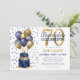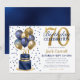 This fabulous men's 70th birthday party invitation featuring a 2-layer navy blue and gold cake with navy blue and gold balloons, the number 70 in gold and shiny blue confetti would be perfect for celebrating your loved one turning 70. It is traditional and classic while being fresh, modern and contemporary. The back is a coordinating navy blue foil.