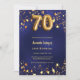A modern, stylish invitation for a 70th birthday. A navy blue background, decorated with golden stars. The blue colour is uneven. Personalise and add your name and party details.