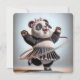 A joyful panda wearing a bow and flowers twirls a colourful rainbow hula hoop while wearing a small pleated skirt and saddle shoes for a 70th birthday party.