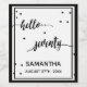 Elegant and modern for a 70th birthday party. White backdrop and black text written with a trendy hand-lettered style script: hello seventy. With small black dots as decor. Templates for name and date, black letters. You can change the background colour to match your theme. Click customise and then "select a background colour" on your right.