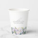 Elegant white rose and blue wildflower floral arrangement decorates the bottom of this 70th birthday party personalised paper cup. 70th is written in a modern script font. The remainder of the text is a spacious serif.
