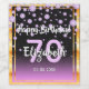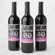 An elegant, glamourous and girly 70th birthday wine or sparkling wine bottle label. Purple and black coloured faux glitter with faux diamond sprinkle and a golden frame. Templates for a name, age 70 and a date. Date of birth or the date of the party/anniversary. With the text: Happy Birthday! White and pink coloured letters. The name is written with a hand-lettered style script.