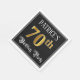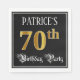 This opulent and ornate birthday themed paper napkin design features a custom name and the message “70th Birthday Party”. The large number “70th” has an imitation/faux gold-inspired colouring pattern, and the words “Birthday Party” are in fancy script-style text. The background is coloured black by default (although it can be customised). Fancy, elegant paper napkins like this might be used at a birthday celebration/party being held to honour somebody’s seventieth birthday. [~Z0000565]