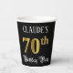 This ornate and luxurious birthday paper cup design features a custom name and the message “70th Birthday Party”. The large number “70th” has an imitation/faux gold-inspired colouring pattern, and the words “Birthday Party” are in elegant script-style text. The background is coloured black by default (although it can be customised). Opulent, fancy paper cups like this might be used at a birthday party/celebration being held in celebration of somebody’s 70th birthday. [~Z0000567]