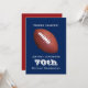 A football on a dark blue background decorates this unique and fun 70th Birthday Party Invitation. The reverse has white lettering on a red background. You can easily change the text for name, age, event, date, etc. Football players, fans, and coaches will love it! All Rights Reserved © 2015 Alan & Marcia Socolik.