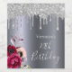 A label for a 70th birthday party. A dark faux silver metallic looking background. Decorated with dark purple and burgundy and rose pink flowers, faux silver glitter dripping, paint drip look. Templates for a name. The text: 70th Birthday is written with a large modern hand lettered style script.