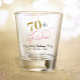 Elegant and chic 70th birthday party shot glass. "70 & Fabulous" is written in a a stylish gold, pink and black script and you can personalise with her name and the party date.