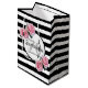 Classic slim black and white horizontal stripes as background. With girly, feminine and romantic pink roses as decoration. Perfect for an elegant 70th birthday party for her. A white and black frame with templates for name, age and a date. Age number 70 in grey, name and date in black. The name is written with a hand lettered style script.