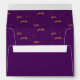 Outside: purple background colour. Back: template for a name and address. Golden text. Inside: Purple background and faux gold text written with a trendy hand-lettered style script: hello seventy. With golden dots as decor. A simple and trendy envelope for your 70th birthday party invitations, save the dates or thank you cards,