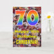 The front of this colourful, nature-inspired, and autumn-themed birthday greeting card design features a large number "70" having a rainbow spectrum gradient inspired pattern. It also features the message "Happy 70th Birthday,", and a custom name. The background of the front of the card features a rustic fallen autumn leaves pattern. The inside features a custom birthday greeting message, or could perhaps be cleared and left blank if a message is to be written by hand instead. A personalised birthday card like this might be a fun way to send birthday wishes to somebody who is celebrating their seventieth birthday. [~Z0000384]