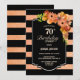 Black and faux glitter coral striped floral 70th birthday dinner party invitation.