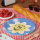 White flower graphic with glowing sunshine, smile, and eyeballs on a blue summer sky background for a 70th birthday party.