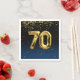 Gold mylar party balloons on gradient black and blue with gold star confetti for 70th anniversary or birthday party.