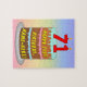 This upbeat and joyful birthday themed jigsaw puzzle design features a cartoon-style depiction of a three-tier birthday cake having number-shaped candles on top showing the age “71“, along with the message “HAPPY 71ST BIRTHDAY,”, and an editable recipient name. The background has a multicolored pastel rainbow spectrum inspired gradient pattern. A cheerful, customisable birthday puzzle like this might be a fun way to deliver a birthday greeting message to somebody who is celebrating their seventy-first birthday. [~Z0000621]