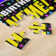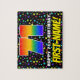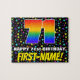 This cheerful and exciting birthday themed jigsaw puzzle design features a large number “71” with a multicolored rainbow spectrum inspired gradient pattern, along with the message “HAPPY 71st BIRTHDAY,”, and a custom recipient name. The background has an eye-catching, multicolored star field pattern. A fun, personalised birthday puzzle like this might be given in celebration of somebody’s seventy-first birthday. [~Z0000607]