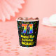 This colourful and exciting music-themed birthday paper cup design features a large number “71” having a rainbow spectrum gradient inspired pattern. It also features the message “Happy 71st Birthday,”, and a personalised name. The background features an exciting and colourful pattern of various music notes and symbols having a variety of sizes and colours. Vibrant, colourful paper cups like this might be fun to use at a birthday party/celebration being held to honour somebody’s seventy first birthday. [~Z0000541]