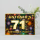 The front of this bold and fun seventy-first birthday party/celebration foil invitation card design features a custom name, a large number “71st”, the message “BIRTHDAY PARTY!”, and a border. The background of the front has a joyful, multicolored bursting celebratory fireworks-inspired pattern. The back features personalised details about the event, such as the date, time, location/venue, and any other relevant information. Customisable invitations like these might be a fun way to invite guests to a birthday gathering being held in celebration of somebody’s 71st birthday. [~Z0000602]