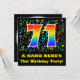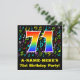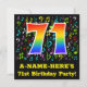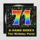 The front of this fun, colourful, and exciting birthday party invitation design features a large number "71" having a rainbow spectrum gradient inspired pattern. It also features a custom name and the message "71st Birthday Party!". Part of the background has a fun and colourful music notes and symbols pattern. The back features customised details/information pertaining to the event that the potential guests are being invited to. Joyful, customisable birthday celebration invitation cards like this might be used when inviting guests to attend a celebration being held to honour a musician’s, a singer’s, a song composer’s, or somebody else’s seventy first birthday. [~Z0000427]