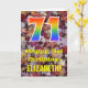The front of this colourful, rustic, and autumn-themed birthday greeting card design features a large number "71" with a rainbow spectrum gradient inspired pattern, along with the message "Happy 71st Birthday,", and a customisable name. The front features a background depicting rustic fallen autumn leaves. The inside features a customised birthday greeting message, or could perhaps be cleared and left blank if a message is to be written by hand instead. A customisable birthday card like this might be a fun way to send birthday wishes to somebody who is celebrating their seventy first birthday. [~Z0000384]