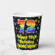 This colourful and exciting birthday paper cup design features a large number “72” having a rainbow spectrum gradient inspired pattern. It also features the message “Happy 72nd Birthday,”, and a custom name. The background features an exciting and colourful pattern inspired by a field of stars. Vibrant, colourful paper cups like this might be fun to have at a birthday celebration being held to celebrate somebody’s 72nd birthday. [~Z0000540]
