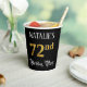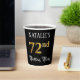 This opulent and ornate birthday themed paper cup design features a customisable name and the message “72nd Birthday Party”. The large number “72nd” has a faux/imitation gold-inspired colouring pattern, the words “Birthday Party” are in luxurious script-style text, and the background is coloured black by default (although it can be customised). Luxurious, elegant paper cups like this might be useful to have at a birthday party/celebration being held to celebrate somebody’s seventy second birthday. [~Z0000567]