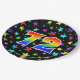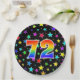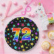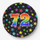This fun, colourful, and cheerful paper plate design features a large number "72" coloured with a rainbow spectrum gradient inspired pattern. The background features a colourful star shapes pattern. Paper plates like this might be used at a party celebrating somebody’s 72nd birthday, or a couple’s 72nd anniversary, or some other seventy second event. [~Z0000493]