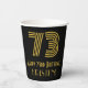 This vintage style and 1920s-1930s style inspired birthday-themed paper cup design features a large art deco inspired style number “73”, plus the birthday greeting message “Happy 73rd Birthday,” and a personalised name. The background is coloured black. Paper cups like this might be used at a birthday party held in celebration of somebody’s 73rd birthday. [~Z0000546]