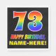 This colourful, fun, and cheerful birthday themed paper napkin design features a large number "73" and the message "HAPPY BIRTHDAY,", both coloured with a rainbow spectrum gradient inspired pattern, along with a bold yellow personalised recipient name. The background is coloured black. Fun, customisable paper napkins like this might be used at a party being held to celebrate somebody’s seventy third birthday. [~Z0000476]