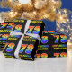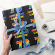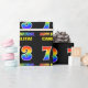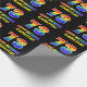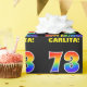 This fun, colourful, and cheerful birthday wrapping paper design features a large number "73" and the message "HAPPY BIRTHDAY,", both having a rainbow spectrum gradient inspired pattern colouring, along with a bold yellow editable recipient name. The background is coloured black. Fun wrapping paper like this might be used when giving a gift or present in honour of somebody’s 73rd birthday. [~Z0000475]