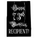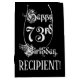 This formal and opulent birthday gift bag design features the message “Happy 73rd Birthday,” in fancy script style text, on a black coloured background. It also features a customisable recipient name. An elaborate gift bag like this might be used when wrapping presents being given to somebody in celebration of their seventy-third birthday. [~Z0000557]