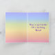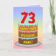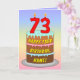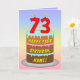 This joyful and cheerful birthday themed greeting card design features a cartoon-style depiction of a three-tier birthday cake having numeral-shaped candles on top showing the number “73“, along with the message “HAPPY 73RD BIRTHDAY,”, and a personalised recipient name. The background of the front features a multicolored pastel rainbow spectrum inspired gradient pattern. The inside has a custom birthday greeting message, or could perhaps be cleared and left blank if a message is to be written by hand instead. An upbeat, customisable birthday greeting card like this might be sent to celebrate somebody’s seventy-third birthday. [~Z0000625]